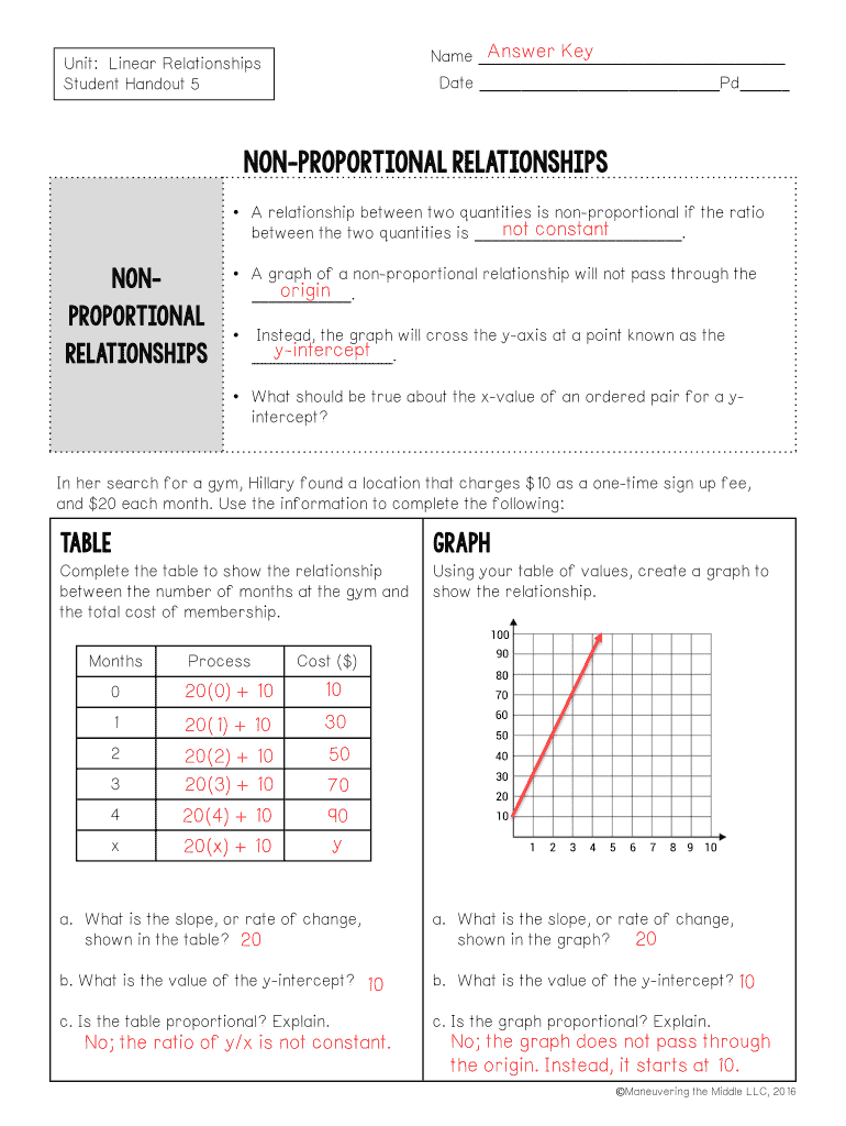 Answer Key Name Unit: Linear Relationships Student Handout 5Date Pd NONproportional relationships A relationship between two quantities is nonproportional if the ratio not constant between the two