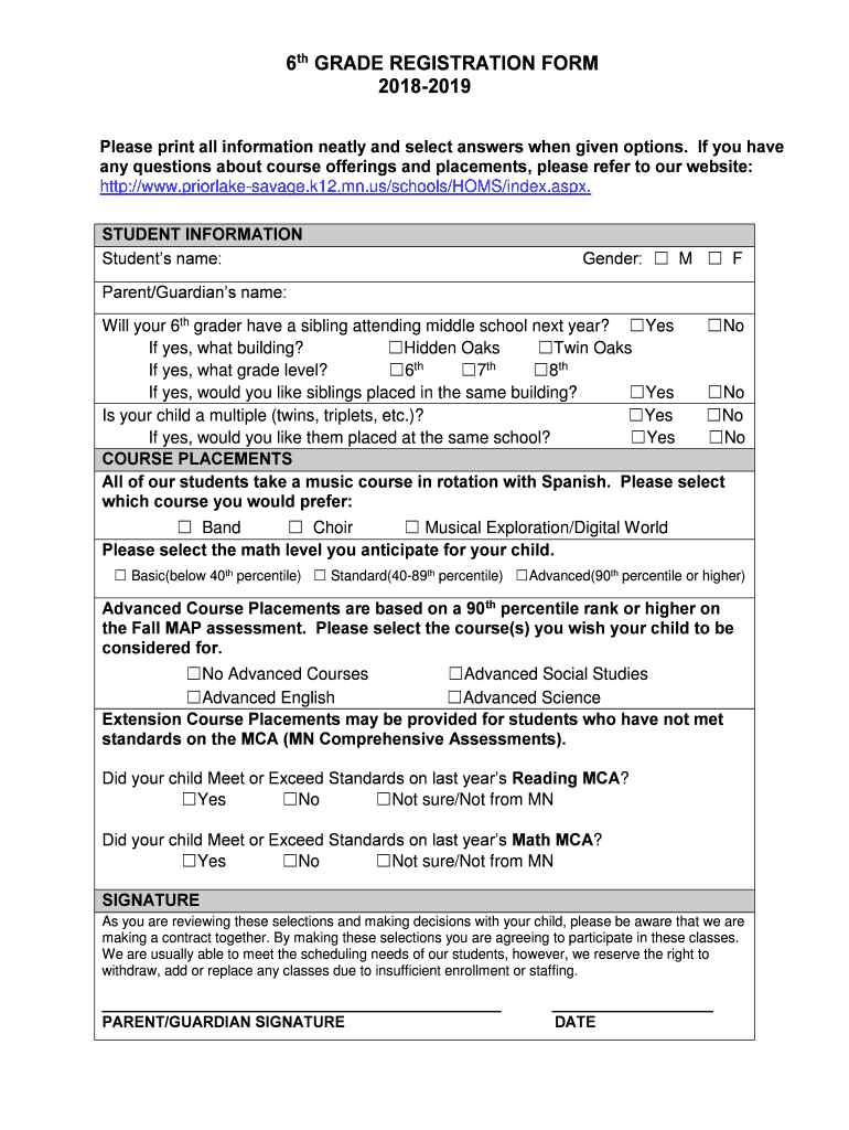 Parents or guardians of students entering 6th grade are usually required to fill out the necessary paperwork for enrollment.