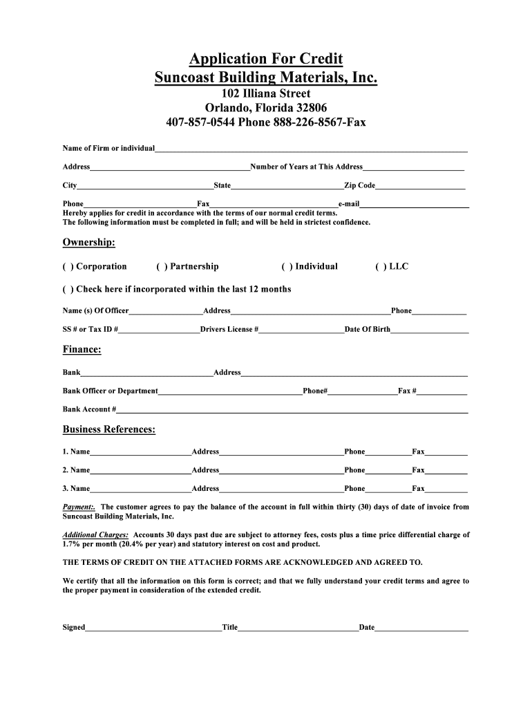 Application For Credit Sun coast Building Materials, Inc. 102 Lilliana Street Orlando, Florida 32806 4078570544 Phone 8882268567Fax Name of Firm or individual Address Number of Years at This Address