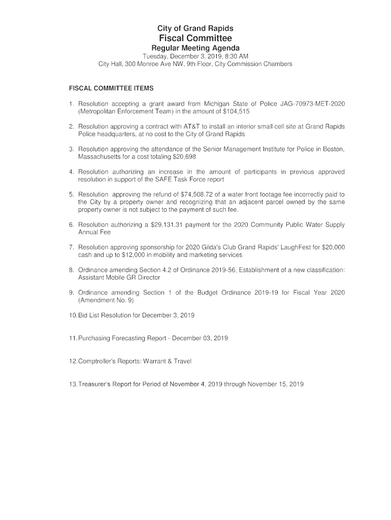 City of Grand RapidsFiscal Committee Regular Meeting Agenda Tuesday, December 3, 2019, 8:30 AM City Hall, 300 Monroe Ave NW, 9th Floor, City Commission ChambersFISCAL COMMITTEE ITEMS 1. Resolution