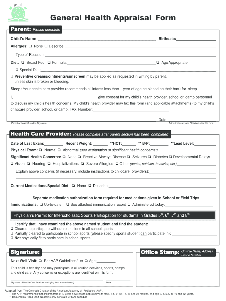 Get the free GENERAL HEALTH APPRAISAL FORM PARENT please complete AND ...
