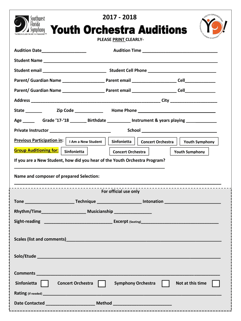 2017 2018 PLEASE PRINT CLEARLYAudition Date Audition Time Student Name Student email Student Cell Phone Parent/ Guardian Name Parent email Cell Parent/ Guardian Name Parent email Cell Address City
