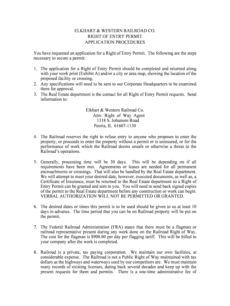 ELKHART & WESTERN RAILROAD CO. RIGHT OF ENTRY PERMITAPPLICATION Procedures have requested an application for a Right of Entry Permit. The following are the steps necessary to secure a permit:1. The