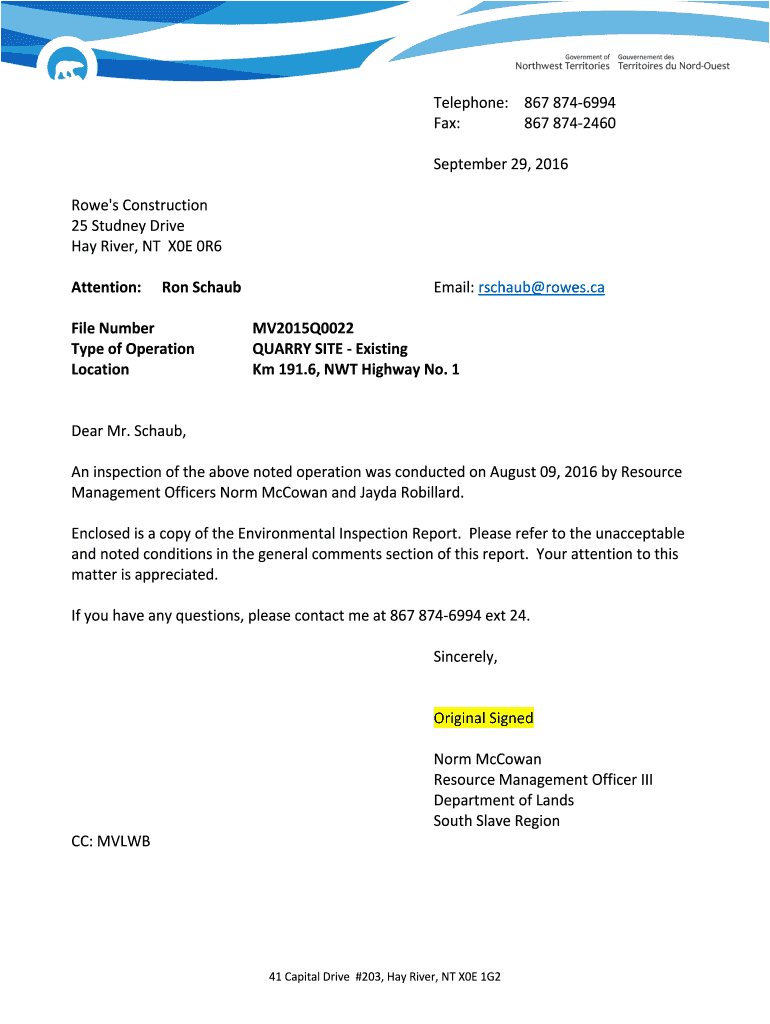 Telephone: 8678746994 Fax: 8678742460 September29,2016 Rowe 'construction 25StudneyDrive Harrier,NTX0E0R6 Attention: Rorschach Email:Richard rows.ca Filename MV2015Q0022 TypeofOperation QUARRYSITEExisting