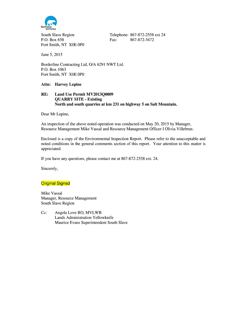 South Slave Region P.O. Box 658 Fort Smith, NT X0E 0P0Telephone: 8678722558 ext 24 Fax: 8678723472June 5, 2015 Borderline Contracting Ltd, O/A 6291 NWT Ltd. P.O. Box 1063 Fort Smith, NT X0E 0P0 Attn: