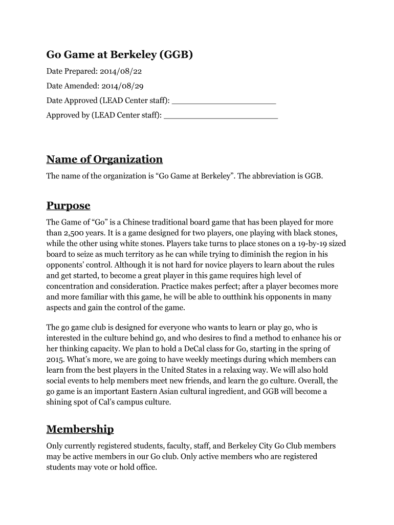 Go Game at Berkeley (GB) Date Prepared: 2014/08/22 Date Amended: 2014/08/29 Date Approved (LEAD Center staff): Approved by (LEAD Center staff): Name of Organization The name of the organization is