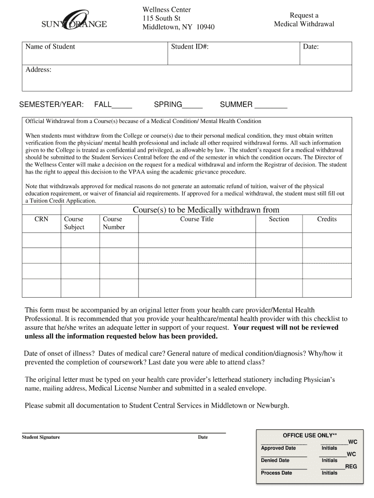 Wellness Center 115 South St Middletown, NY 10940 Name of StudentRequest a Medical WithdrawalStudent ID#:Date:Address:SEMESTER/YEAR:FALL SPRING SUMMER Official Withdrawal from a Course(s) because