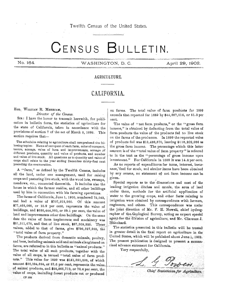 Twelfth Census of the United States. CENSUS BULLETIN. No. 164.WASHINGTON, D. C. April 2911902.AGRICULTURE.CALIFORNIA. Hon. R. MERRIAM, Director of the Census. Son: I have the honor to transmit herewith,