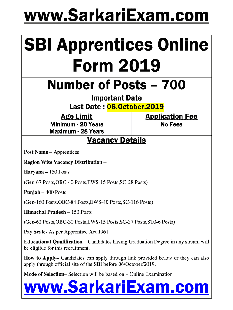WWW.SarkariExam.com SBI Apprentices Online Form 2019 Number of Posts 700 Important Date Last Date : 06. October.2019 Age Limit Application Fee Minimum 20 Years Maximum 28 Years No FeesVacancy Details