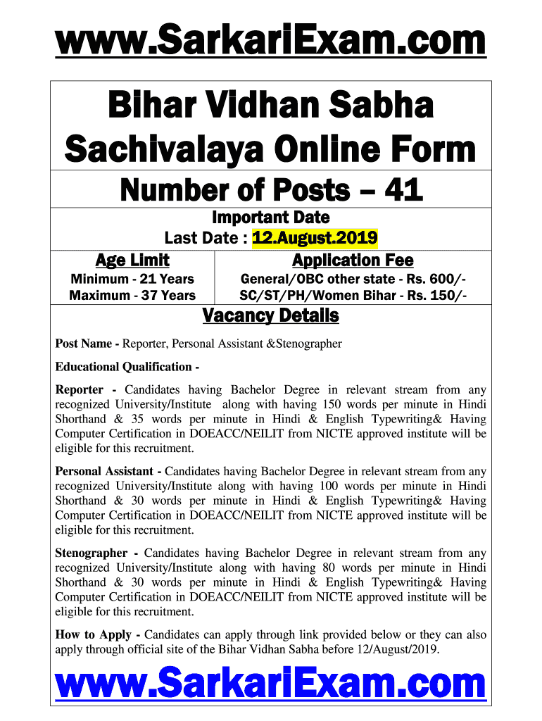 WWW.SarkariExam.com Bihar Vidal Sasha Sachivalaya Online Form Number of Posts 41Important Date Last Date : 12. August.2019 Age Limit Application Fee Minimum 21 Years Maximum 37 YearsGeneral/OBC other