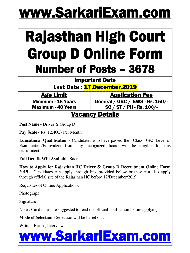 WWW.SarkariExam.com Rajasthan High Court Group D Online Form Number of Posts 3678 Important Date Last Date : 17. December.2019 Age Limit Application Fee Minimum 18 Years Maximum 40 YearsGeneral /