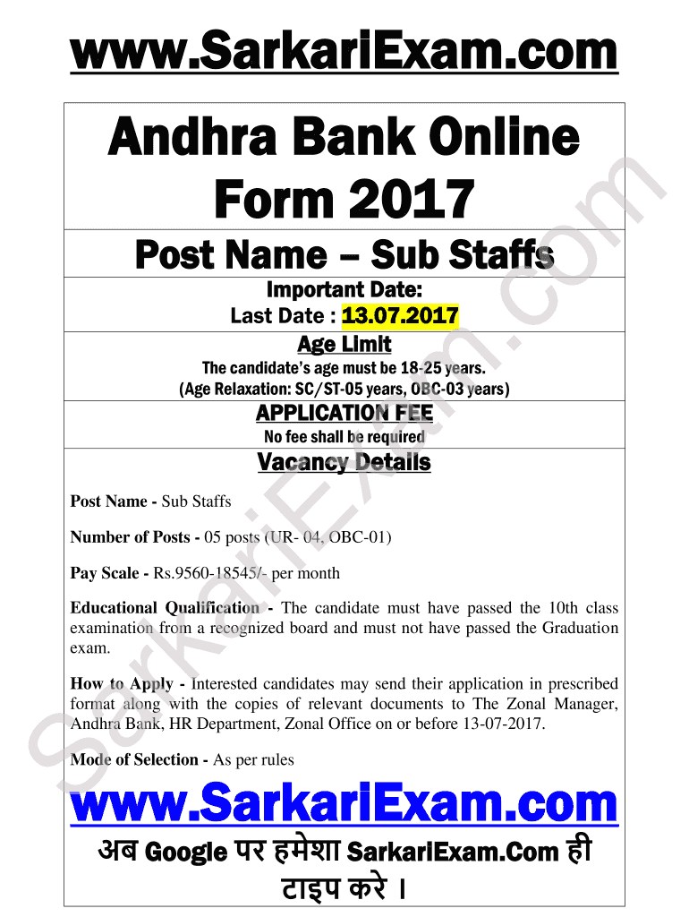 Get the free www.SarkariExam.com Andhra Bank Online Form 2017 SarkariExam