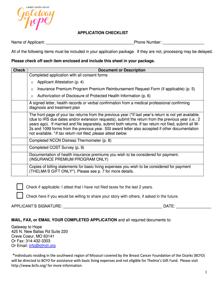 APPLICATION CHECKLIST Name of Applicant: Phone Number: All the following items must be included in your application package. If they are not, processing may be delayed. Please check off each item