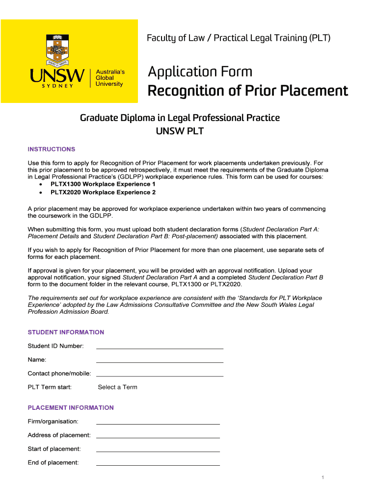 Faculty of Law / Practical Legal Training (PLT)Application Form Recognition of Prior Placement Graduate Diploma in Legal Professional Practice UNSW PLT INSTRUCTIONS Use this form to apply for Recognition