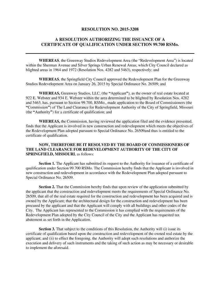 CERTIFICATE OF QUALIFICATION UNDER SECTION 99,700 RSM. WHEREAS, the Greenway Studios Redevelopment Area (the Redevelopment Area)