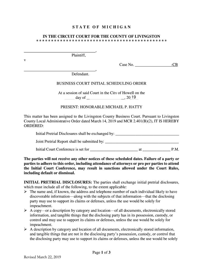 Get the free Business Court Scheduling Order - Livingston County