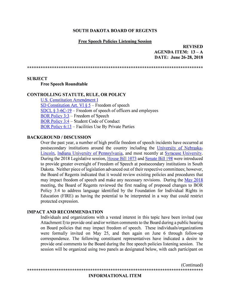 SOUTH DAKOTA BOARD OF REGENTS Free Speech Policies Listening SessionREVISED AGENDA ITEM: 13 A DATE: June 2628, 2018****************************************************************************** SUBJECT