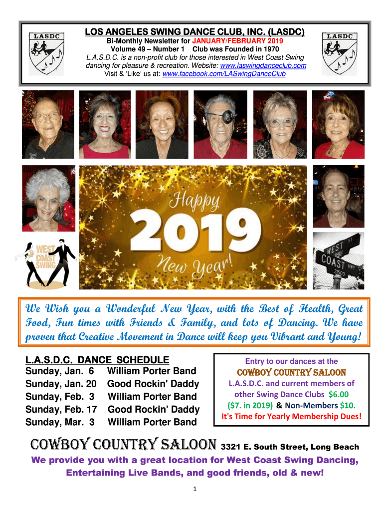 LOS ANGELES SWING DANCE CLUB, INC. (LA SDC) Bimonthly Newsletter for JANUARY/FEBRUARY 2019 Volume 49 Number 1 Club was Founded in 1970 L.A.S.D.C. is a nonprofit club for those interested in West Coast