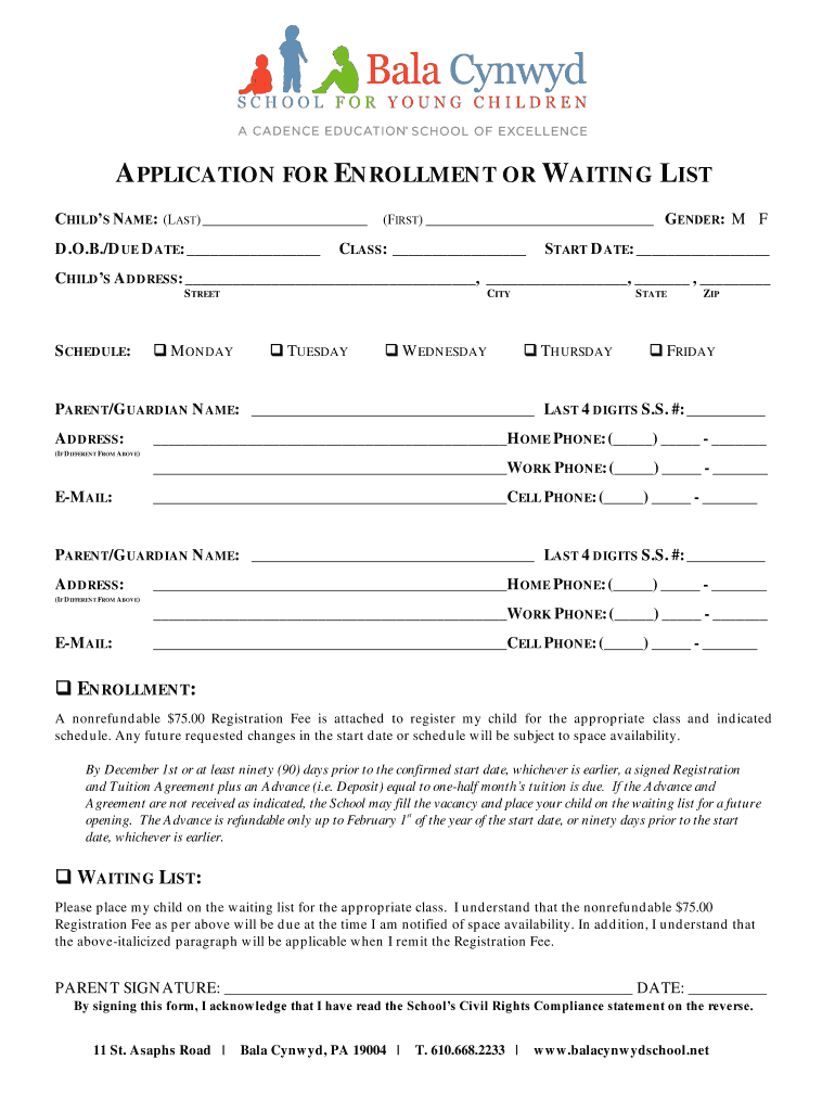 A APPLICATION FOR EN ROLL MEN T OR WAITING G LIST CHILD NAME: (LAST) (FIRST) GENDER: M F D. O.B./D UE D ATE: CLASS : START D ATE: CHILD S A DR ESS :, ,, S STREETS SHED USE: M ON PAUCITY TUESDAY W