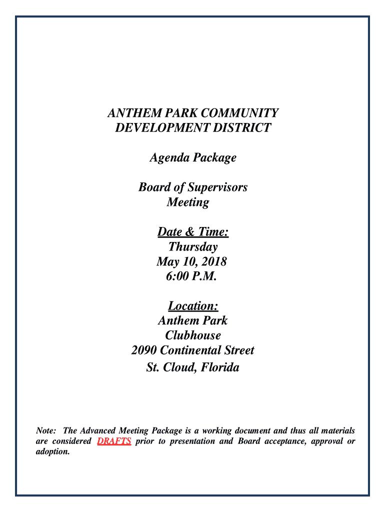 ANTHEM PARK COMMUNITY DEVELOPMENT DISTRICT Agenda Package Board of Supervisors Meeting Date & Time: Thursday, May 10, 2018 6:00 P.M. Location: Anthem Park Clubhouse 2090 Continental Street St. Cloud,