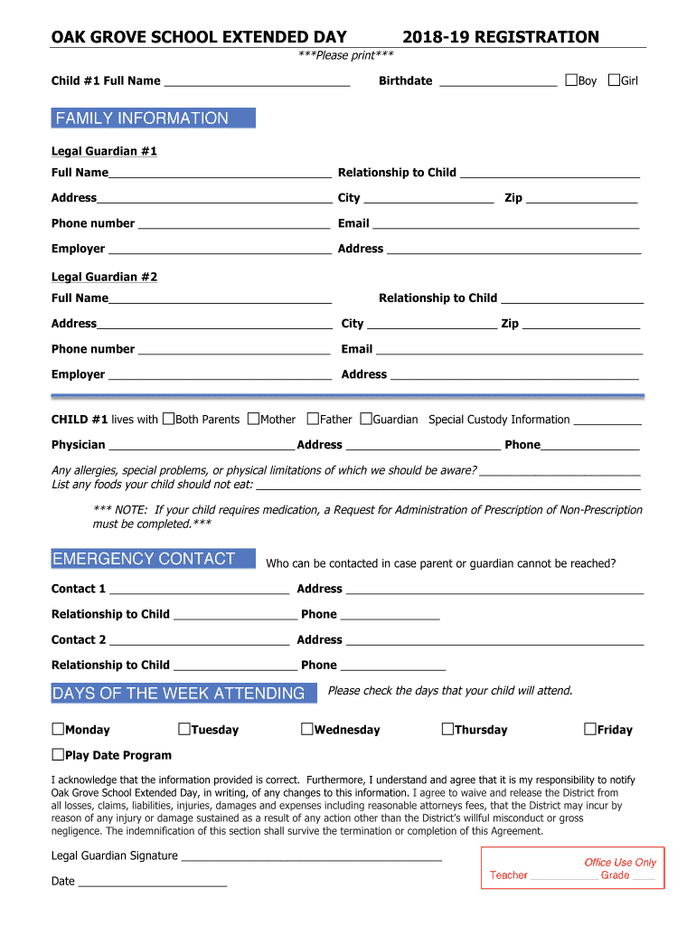 OAK GROVE SCHOOL EXTENDED DAY201819 REGISTRATION***Please print*** Child #1 Full Name Birthdate BoyGirlFAMILY INFORMATION Legal Guardian #1 Full Name Relationship to Child Address City Zip Phone number