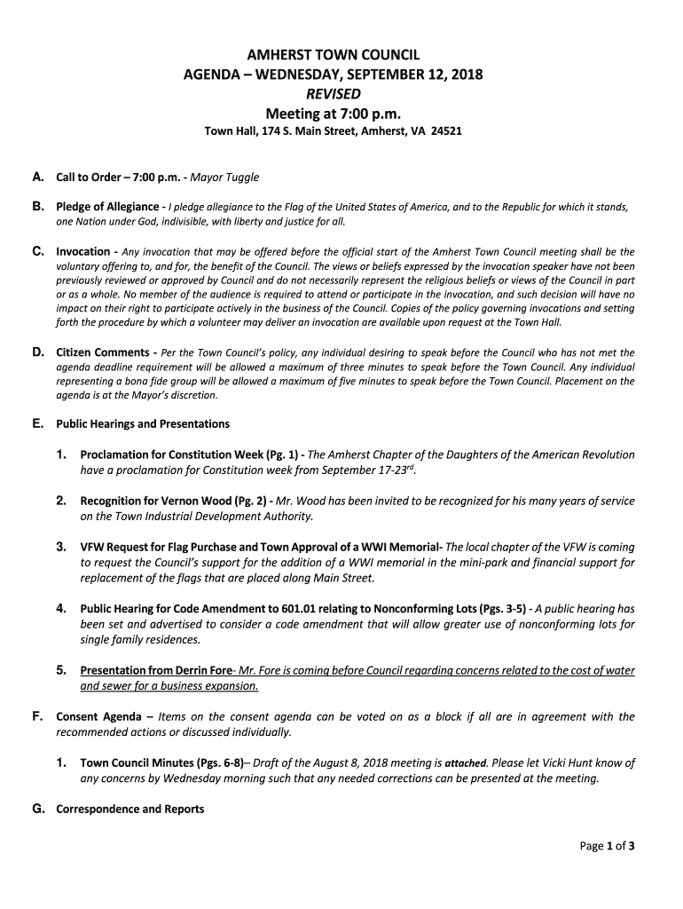 AMHERST TOWN COUNCIL AGENDA WEDNESDAY, SEPTEMBER 12, 2018, REVISED Meeting at 7:00 p.m. Town Hall, 174 S. Main Street, Amherst, VA 24521A. Call to Order 7:00 p.m. Mayor Juggle B. Pledge of Allegiance