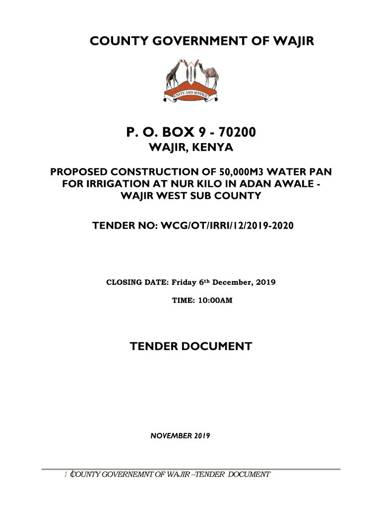COUNTY GOVERNMENT OF WARP. O. BOX 9 70200 MAJOR, KENYA PROPOSED CONSTRUCTION OF 50,000M3 WATER PAN FOR IRRIGATION AT OUR KILO IN ADANA WALE MAJOR WEST SUB COUNTY TENDER NO: WCG/OT/INRI/12/20192020CLOSING