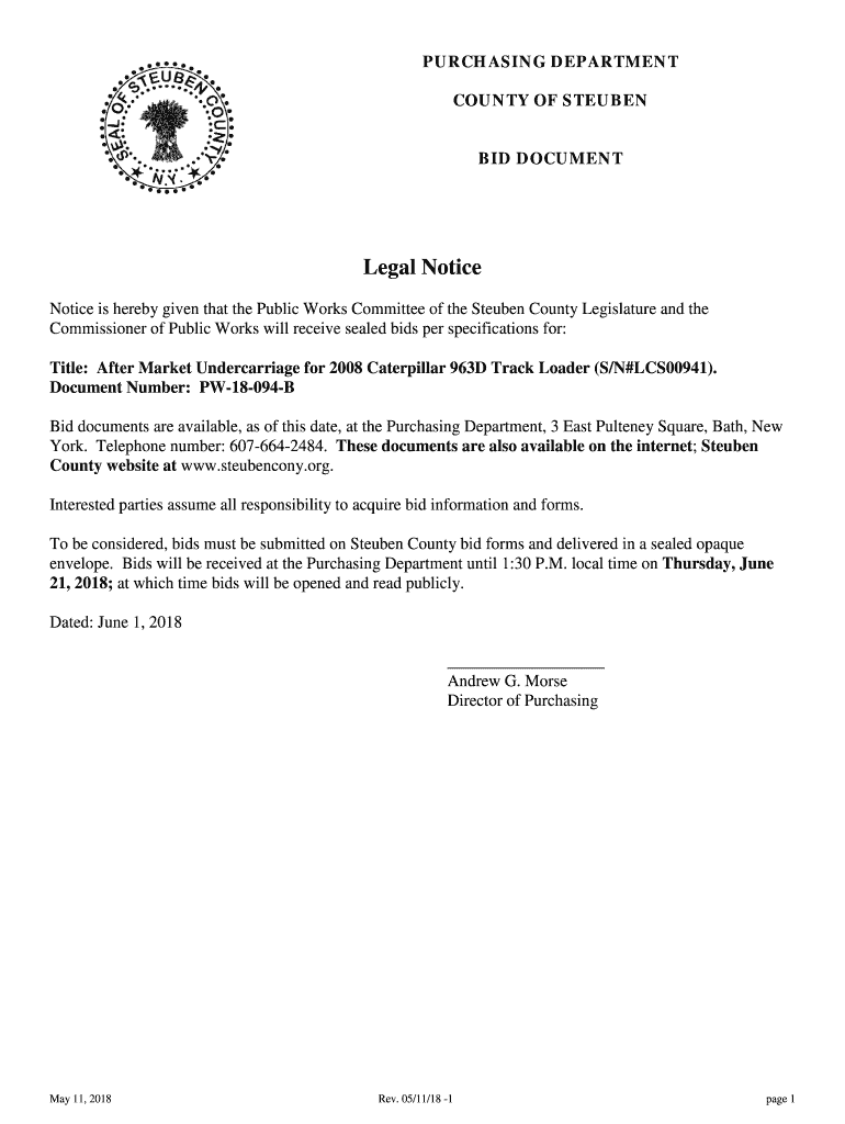 BID DOCUMENTLegal Notice is hereby given that the Public Works Committee of the Steuben County Legislature and the