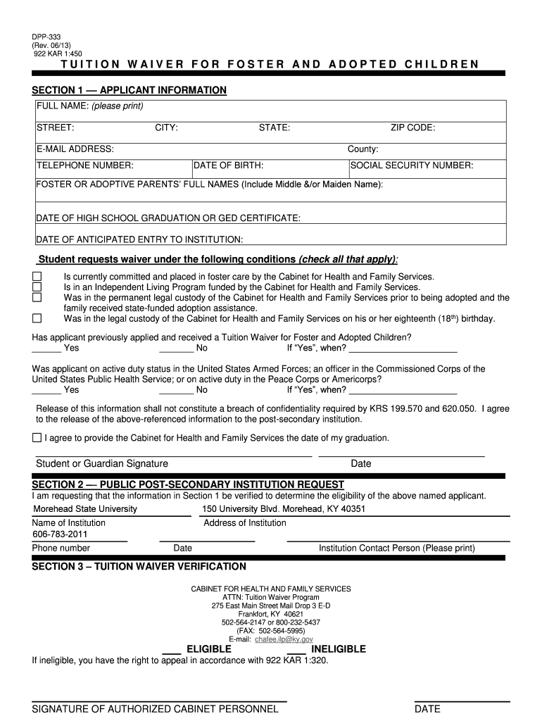 DPP333 (Rev. 06/13) 922 CAR 1:450TUITION WAIVER FOR FOSTER AND ADOPTED CHILDREN SECTION 1 APPLICANT INFORMATION FULL NAME: (please print) STREET:CITY:STATE:ZIP CODE:EMAIL ADDRESS:County:TELEPHONE