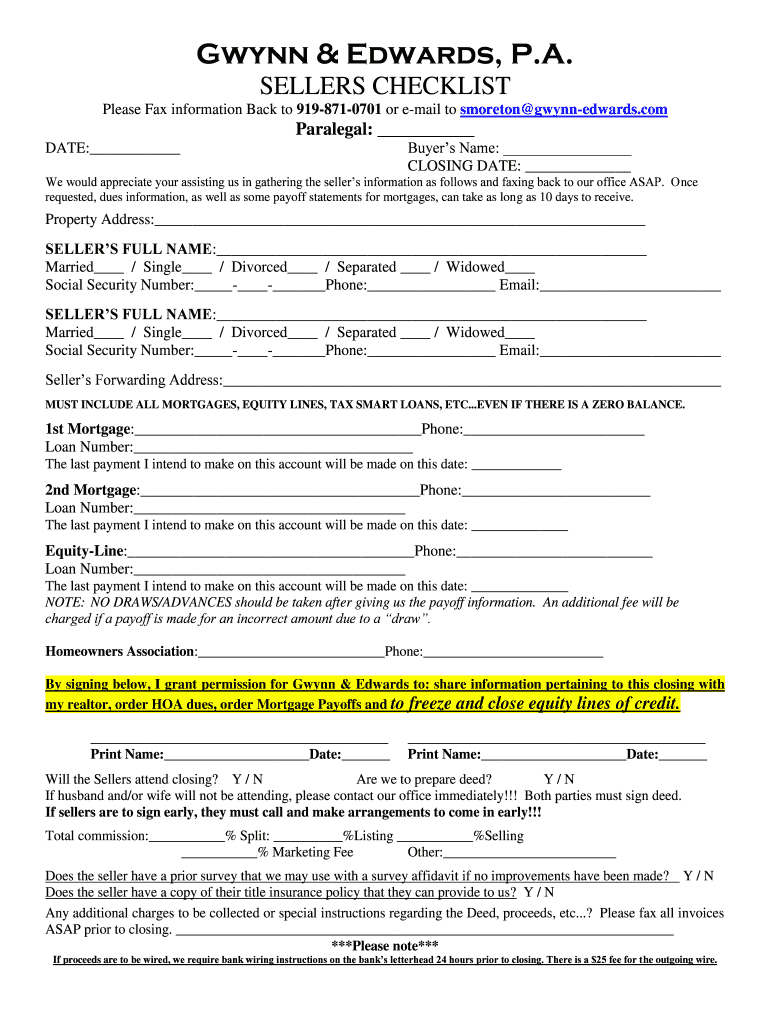 Wynn & Edwards, P.A. SELLERS CHECKLIST Please Fax information Back to 9198710701 or email to Morton gwynnedwards.paralegal: DATE: Buyers Name: CLOSING DATE: We would appreciate your assisting us in