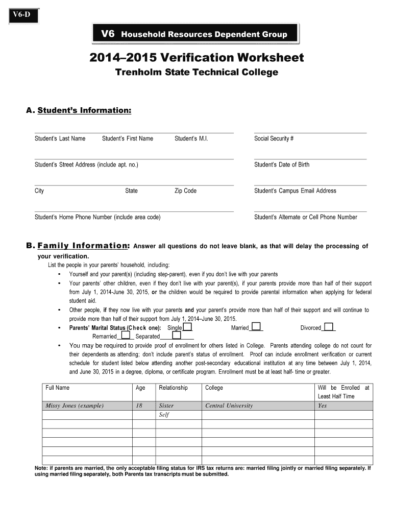 V6-D V6 Household Resources Dependent Group 2014 2015 Verification Worksheet Threshold State Technical College A. Student s Information: Student s Last Name Student s First Name Student s M.I. Student