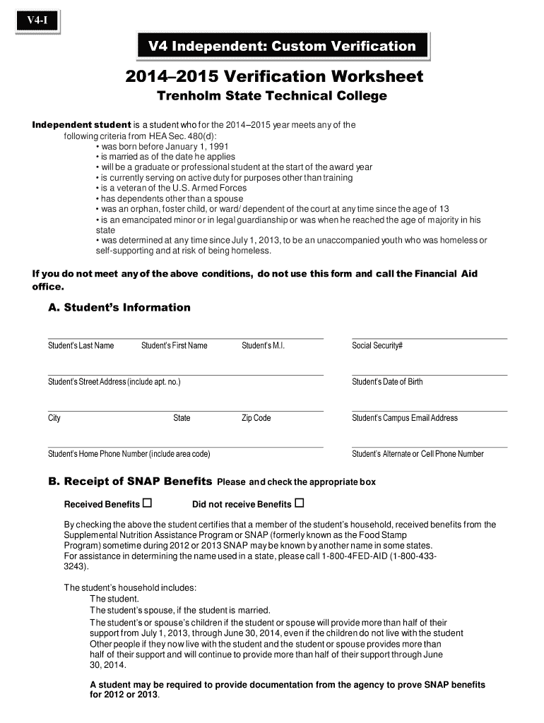 V4-I V4 Independent: Custom Verification 2014 2015 Verification Worksheet Threshold State Technical College Independent student is a student who f or the 2014 2015 year meets any of the following