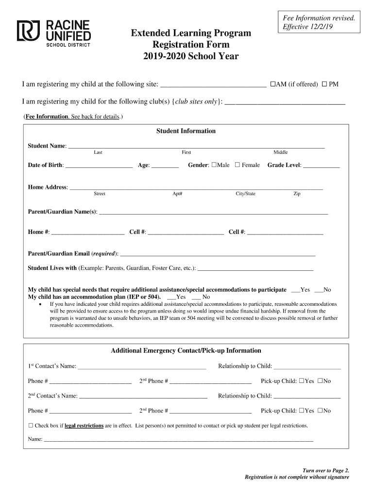 Fee Information revised. Effective 12/2/19Extended Learning Program Registration Form 20192020 School Year am I registering my child at the following site: AM (if offered) PM I am registering my child