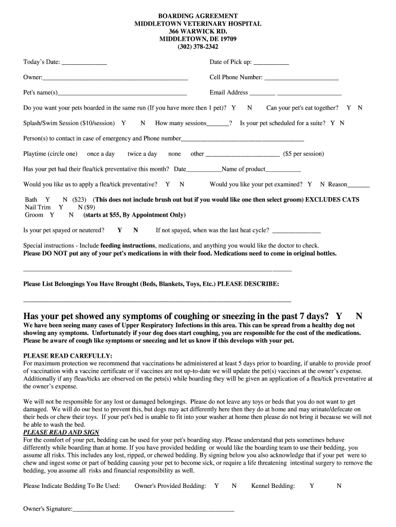 Get the free BOARDING AGREEMENT MIDDLETOWN VETERINARY HOSPITAL 366 ...