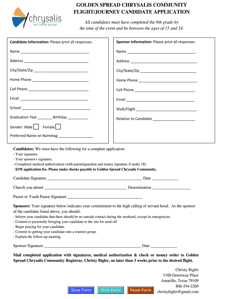 GOLDEN SPREAD CHRYSALIS COMMUNITY FLIGHT/JOURNEY CANDIDATE APPLICATION All candidates must have completed the 9th grade by the time of the event and be between the ages of 15 and 24. Candidate Information: