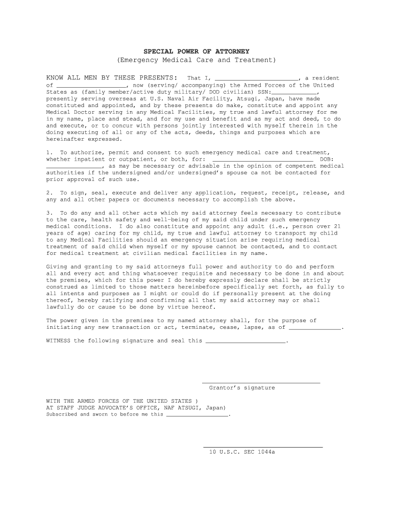 SPECIAL POWER OF ATTORNEY (Emergency Medical Care and Treatment) KNOW ALL MEN BY THESE PRESENTS:That I, a resident of, now (serving/ accompanying) the Armed Forces of the United States as (family