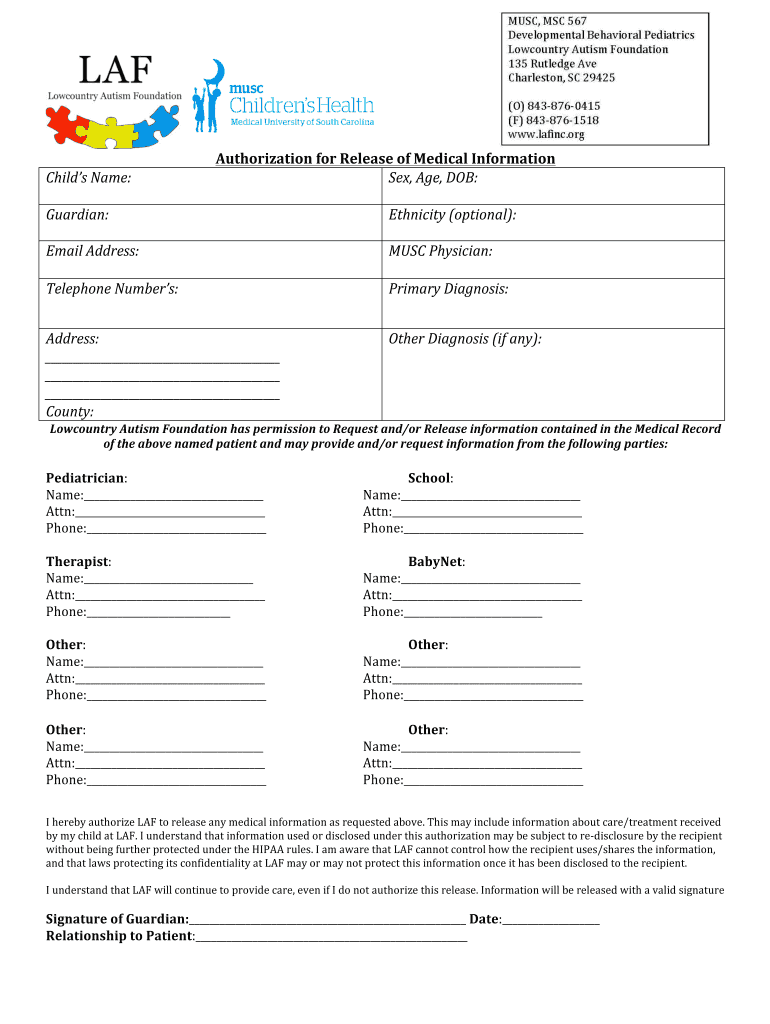 Child's Name:Guardian:Authorization for Release of Medical Information, Age, DOB:Ethnicity (optional):Email Address:MUST Physician:Telephone Numbers:Primary Diagnosis:Address: County:Other Diagnosis