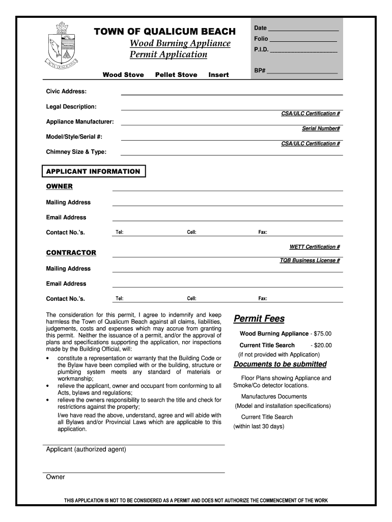 TOWN OF QUALITY BEACH Wood Burning Appliance Permit Application Wood StovePellet StoveInsertDate Folio P.I.D. BP# Civic Address: Legal Description: CSA/ULC Certification #Appliance Manufacturer: Serial
