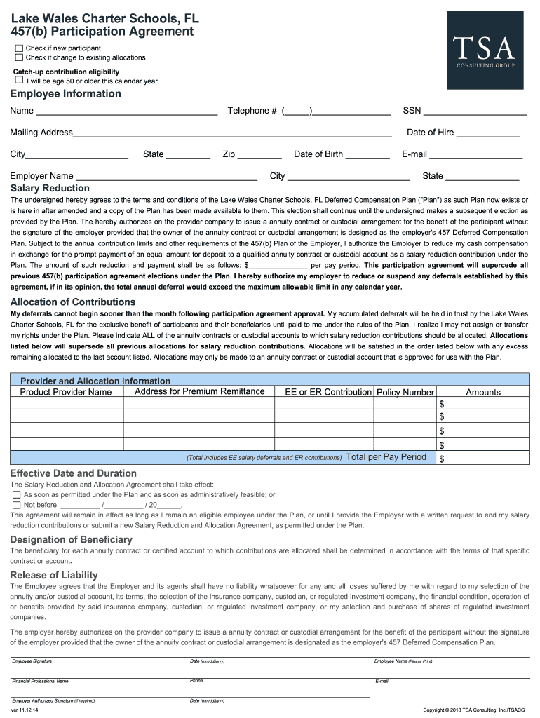 Lake Wales Charter Schools, FL 457(b) Participation Agreement Check if new participant Check if change to existing allocations Catch up contribution eligibility I will be age 50 or older this calendar