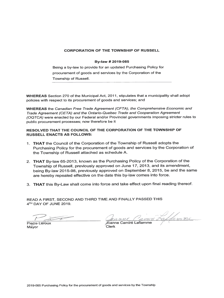 CORPORATION OF THE TOWNSHIP OF RUSSELLBylaw #2019085