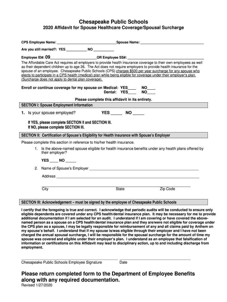 Chesapeake Public Schools 2020 Affidavit for Spouse Healthcare Coverage/Spousal Surcharge CPS Employee Name: Spouse Name: Are you still married?: YES NO Employee ID#: 09 OR Employee SS#: The Affordable