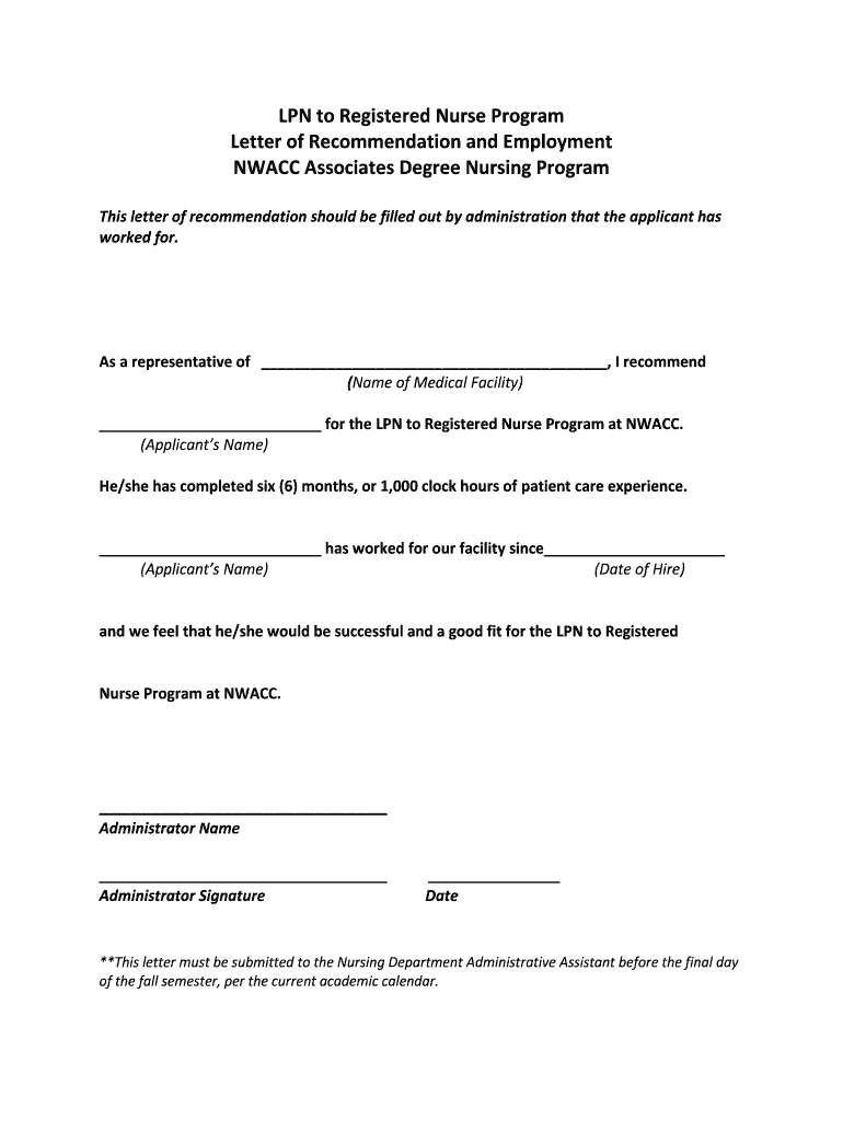LPN to Registered Nurse Program Letter of Recommendation and Employment NWACC Associates Degree Nursing Program This letter of recommendation should be filled out by administration that the applicant