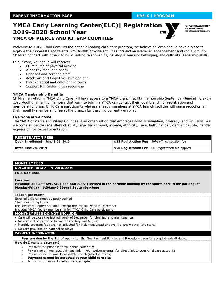 CHILD NAME:BIRTHDATE:PARENT INFORMATION PAGE PREY PROGRAM All fields must be completed for registration packet to be considered complete. YMCA Early Learning Center(ETC) Registration 20192020 School