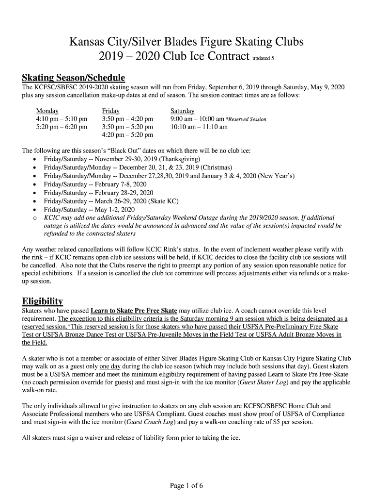 Kansas City/Silver Blades Figure Skating Clubs 2019 2020 Club Ice Contract updated 5 Skating Season/Schedule The KC FSC/SB FSC 20192020 skating season will run from Friday, September 6, 2019, through