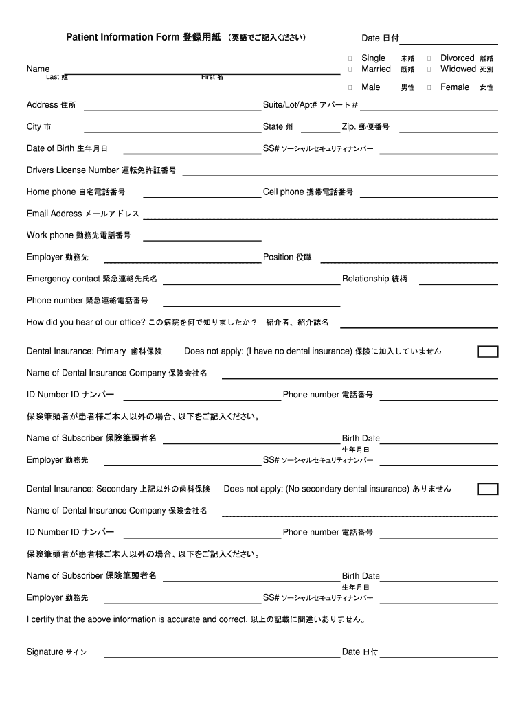 Patient Information Form Date ;Nameless First Single Married;;;Divorced Widowed ;Male;FemaleAddress Suite/Lot/Apt# City State Date of Birth SS# Zip. Driver's License Number Home phone Cell phone Email.