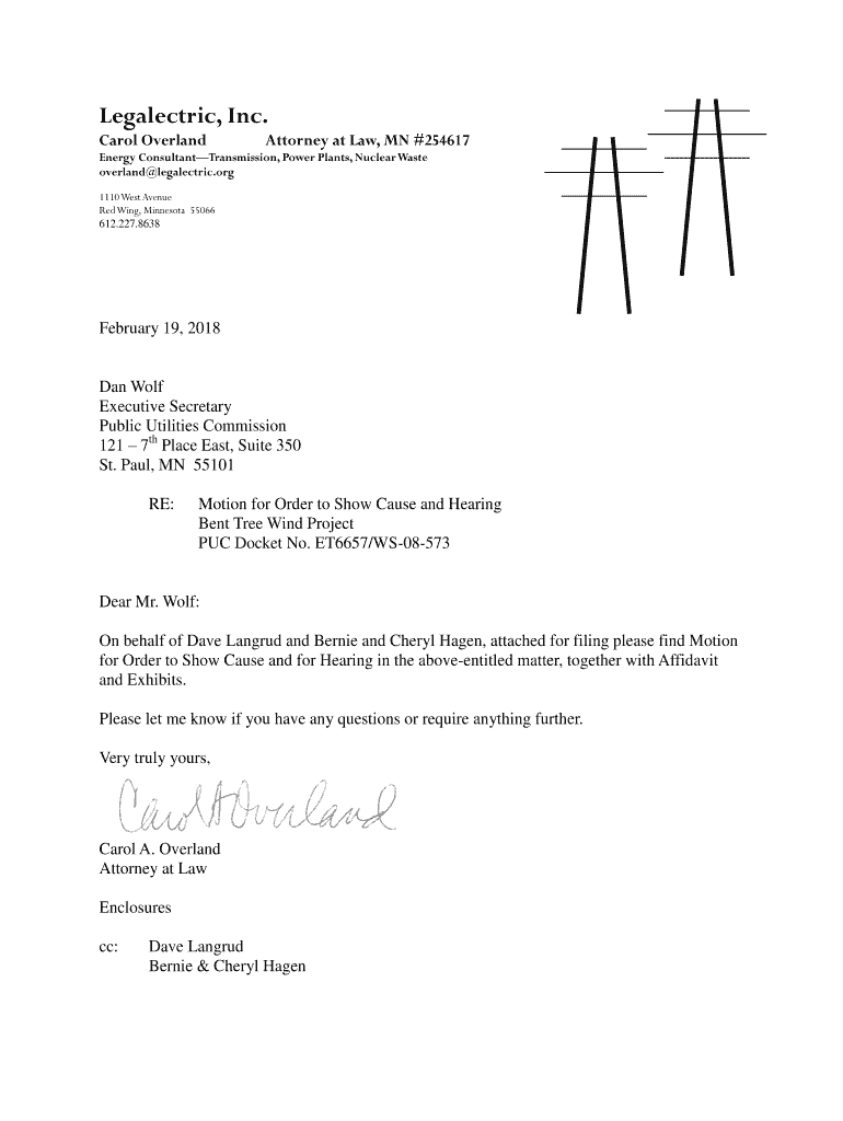 Electric, Inc. Carol OverlandAttorney at Law, MN #254617Energy ConsultantTransmission, Power Plants, Nuclear Waste overland electric.org 1110 West Avenue Red Wing, Minnesota 55066 612.227.8638February