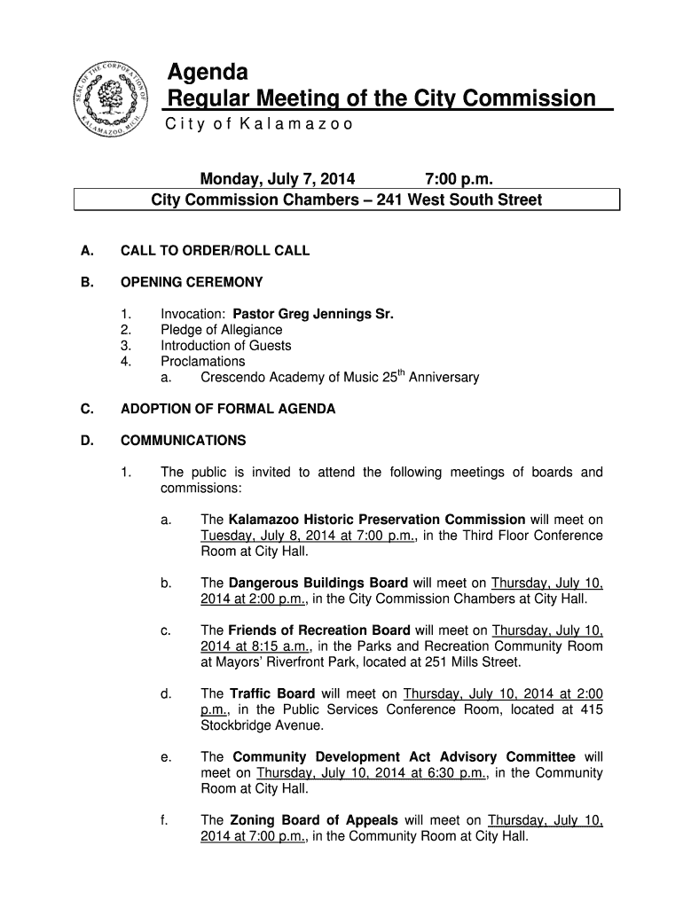 Ag agenda Re regular Meeting NG of TH he is City y Com mission on City of Kalamazoo Monday y, July 7, 2014 7:0 00 p.m. ion Cham C Myers 2 241 West South Street City Commits A.CALL C TO ORDER/RO O