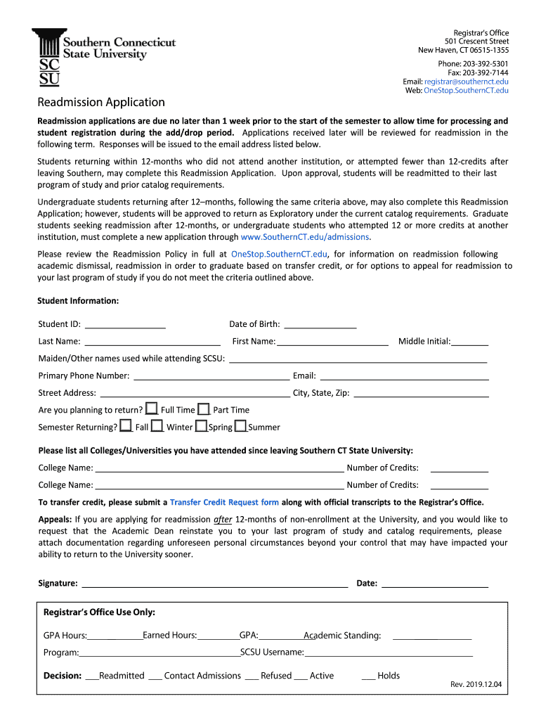 Registrar's Office 501 Crescent Street New Haven, CT 065151355 Phone: 2033925301 Fax: 2033927144 Email: registrar southern ct.edu Web: One's top. Southern CT.readmission Application Readmissionapplicationsareduenolaterthan1weekpriortothestartofthesemestertoallowtimeforprocessingand