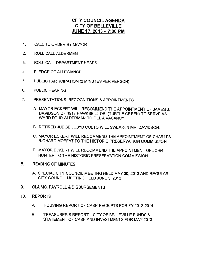 CITY COUNCIL AGENDA CITY OF BELLEVILLE JUNE 17, 2013 7:00 PM 1.CALL TO ORDER BY MAYOR2.ROLL CALL ALDERMEN3.ROLL CALL DEPARTMENT HEADS4.PLEDGE OF ALLEGIANCE5.PUBLIC PARTICIPATION6.PUBLIC HEARING7.PRESENTATIONS,