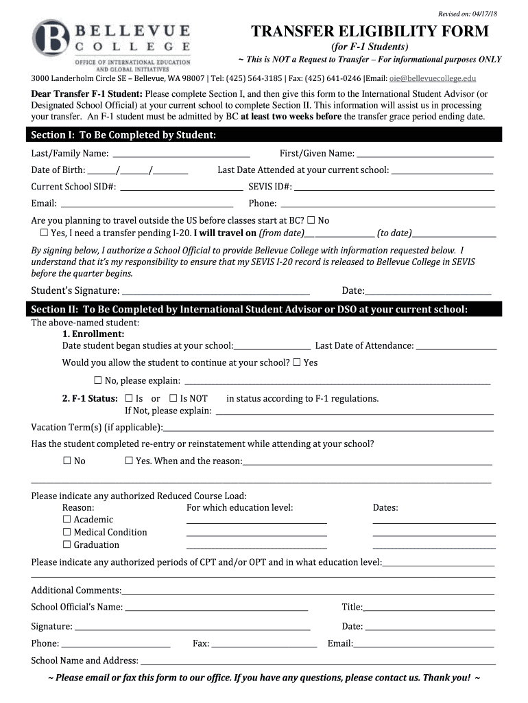 Revised on: 04/17/18TRANSFER ELIGIBILITY FORM (for F1 Students) This is NOT a Request to Transfer For informational purposes ONLY 3000 Lauderhill Circle SE Bellevue, WA 98007 Tel: (425) 5643185 Fax: